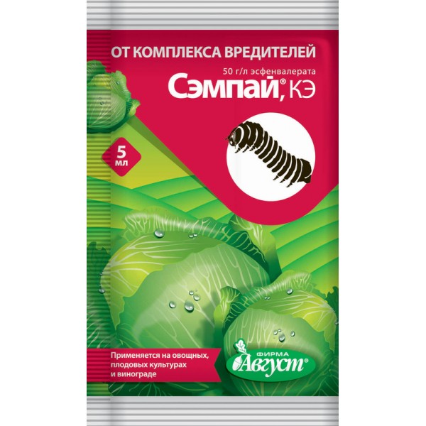 Сэмпай от комплекса вредителей — популярное средство скоростной борьбы с различными листогрызущими насекомыми. Отравитель на основе эсфенвалерата 50 г/л., обеспечивающий эффективную дезинсекцию посадок уже в первые 20 мин. после распыления на культуре. Вещество продолжает защищать угодья более 2-х недель. Губительно действует на вредителя любой стадии развития (имаго, личинка, яйца и пр.).