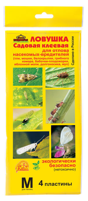 Ловушка садовая клеевая для отлова насекомых-вредителей (тли, мошки, белокрылки, грибного комара, бабочки-плодожорки, яблонной моли, долгоносика, мух). Используется для защиты овощей, фруктовых деревьев, цветов, как в парниках, так и на открытых участках. Привлекает и уничтожает садовых вредителей, таких как тля, мошка, белокрылка, плодожорка, а также для отлова мух и других мелких насекомых. Желтый цвет ловушки отражает свет на длине волны, которая привлекает насекомых. В клеевом составе ловушки не используются яды, она абсолютно безопасна для человека и домашних животных.